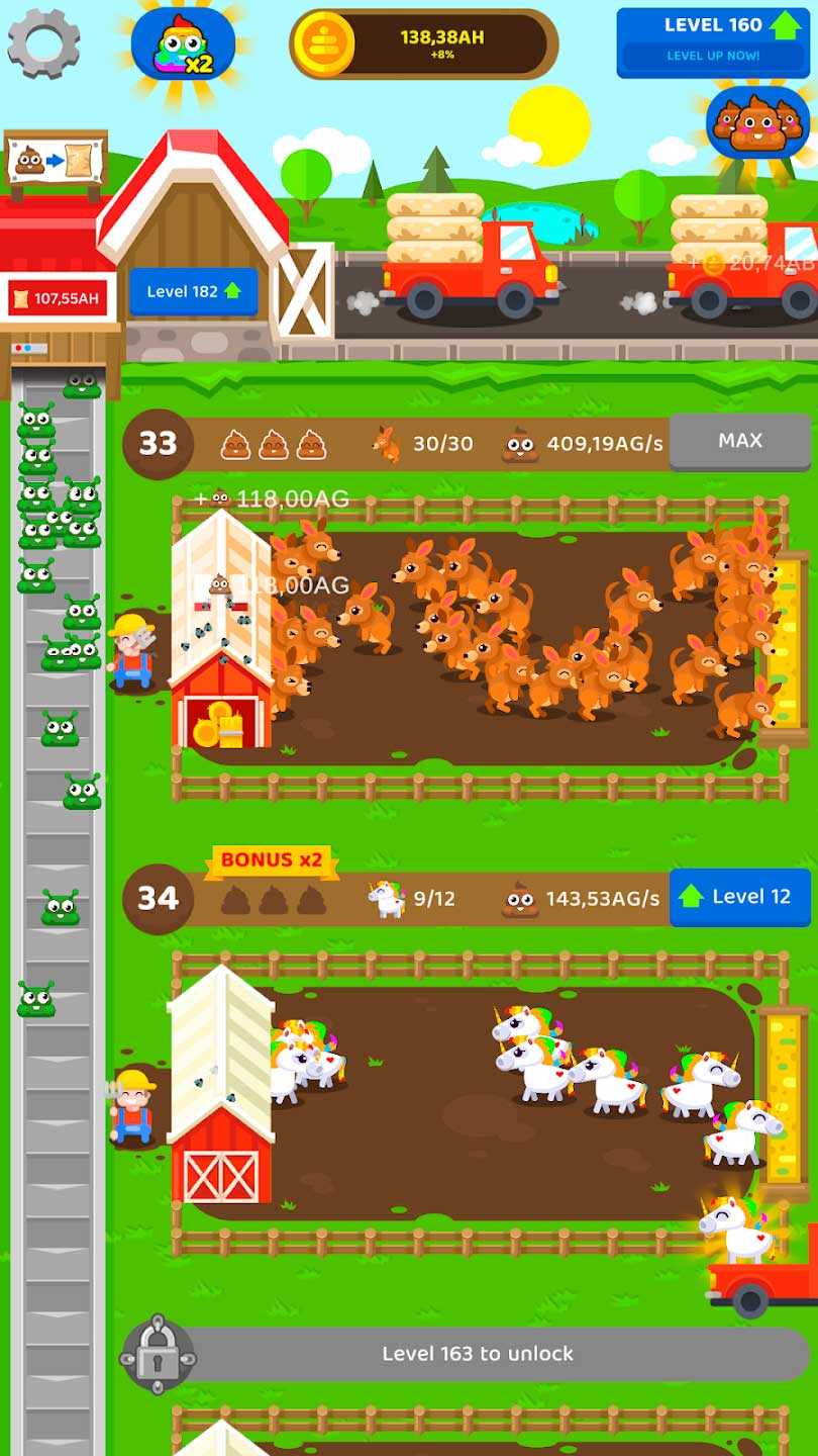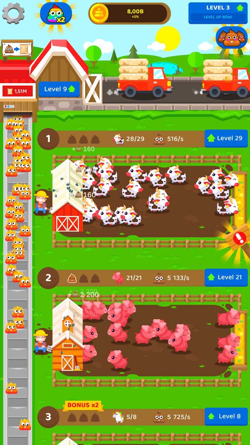 Fertilizer Farm – это занимательный симулятор фермера, где каждый может построить успешный сельскохозяйственный бизнес на мировом уровне. Зарабатывать здесь можно на обычном навозе – просто собирайте его как можно больше и развивайте свое хозяйство. Незатейливая механика приложения, милые животные, простое управление и очаровательная атмосфера всегда поднимут вам настроение и помогут скоротать время. Играйте и отдыхайте, собирая какашки различных животных и создавая свою навозную империю.