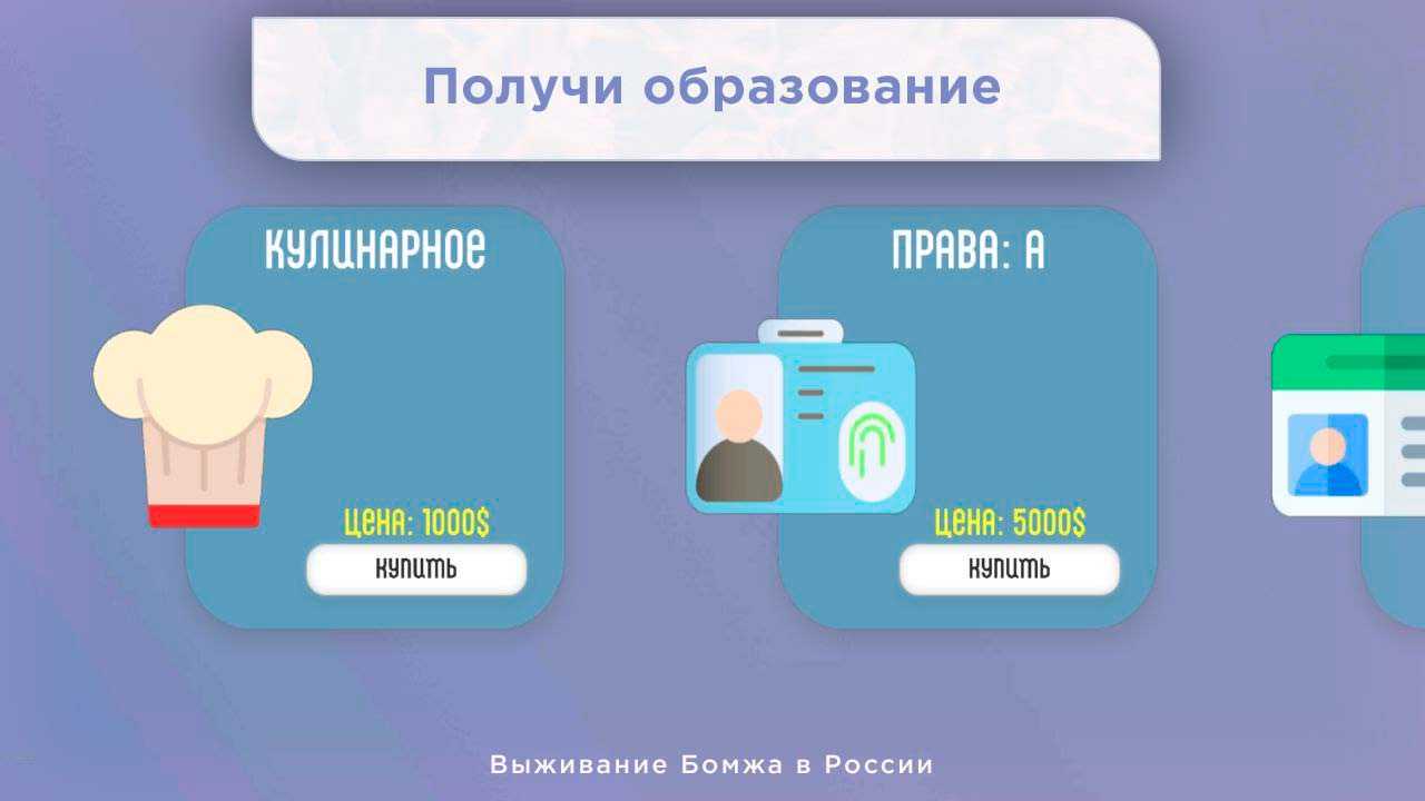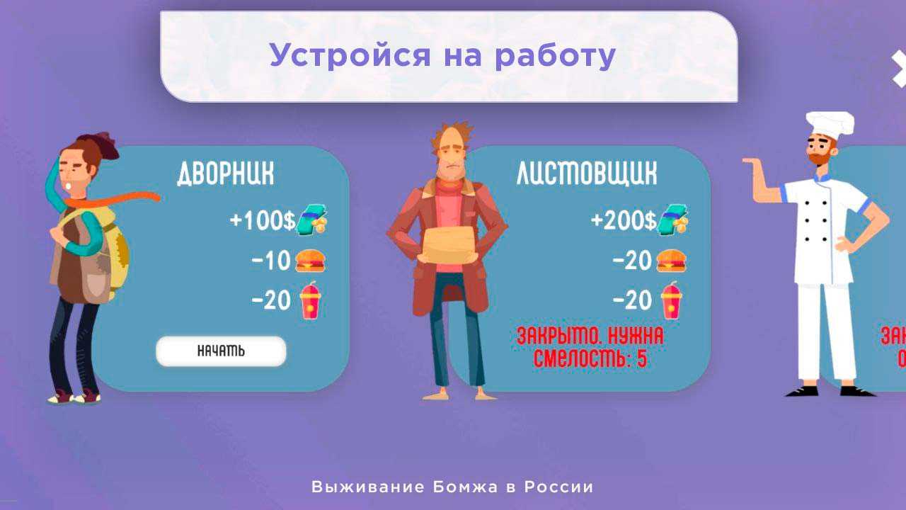 Выживание Бомжа в России – это необычный симулятор жизни, в котором вы сможете примерить на себя роль бездомного на просторах России. Начинайте с простой работы за еду и постепенно развивайтесь, получайте образование и двигайтесь к успеху. Выполняйте разнообразные задания, чтобы побыстрее устроиться в жизни и стать полноправным достойным членом общества. Разные виды профессий открывают широкие возможности для выбора, тут вы сможете стать кем захотите и исполнить свою мечту.