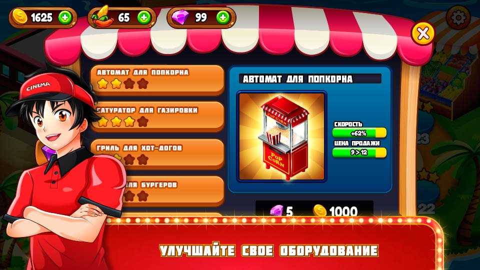 Кинопаника: Ресторан и кафе – это продолжение популярной кулинарной игры, где вам предстоит обслуживать клиентов кинотеатра, предлагая им разнообразные закуски. Люди ожидают своего сеанса, и вы можете скрасить их ожидание вкусным попкорном, гамбургерами, хот-догами и многими другими вкусняшками. Открывайте новые фильмы и улучшайте ваши навыки. Развивайте кинотеатр и пробуйте разные игровые возможности. Играть тут очень просто, с настройками и управлением справится любой новичок.