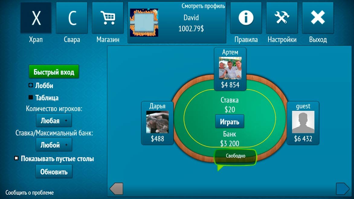 В некоторые карточки очень интересно играть и проводить огромное количество времени вместе с друзьями. Можете скачать Hrapoff - карточная игра Храп и Свара (Сека) на андроид и принять участие в очень древней и такой популярной игре с использованием карточек. Вам предстоит познать все эти уникальные правила такой классической оригинальной игры. Раньше у вас не было бы возможности играть вместе с друзьями в любое время и в любом месте. Теперь можно подключиться к игровому процессу через мобильное устройство и наслаждаться веселыми поединками. Возможно, раньше вы и были знакомы с такой интересной игрой, но она чаще называлась Фрапом.