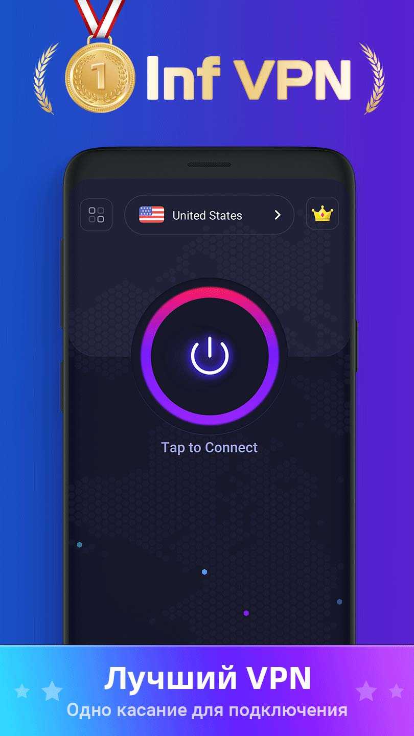 VPN Inf – это быстрый и защищенный VPN, с которым вы всегда сможете попасть на заблокированные в вашем регионе сайты и сохраните при этом анонимность. Здесь не требуется проводить долгую настройку и нажимать кучу кнопок – все делается просто и быстро с помощью одной кнопки. Однажды выбрав такое соединение с высокой скоростью передачи данных и инновационными опциями шифрования, вы больше не захотите от него отказываться. И это вполне логично, весь с таким приложением открывается масса возможностей для работы и отдыха на просторах мировой информационной сети.