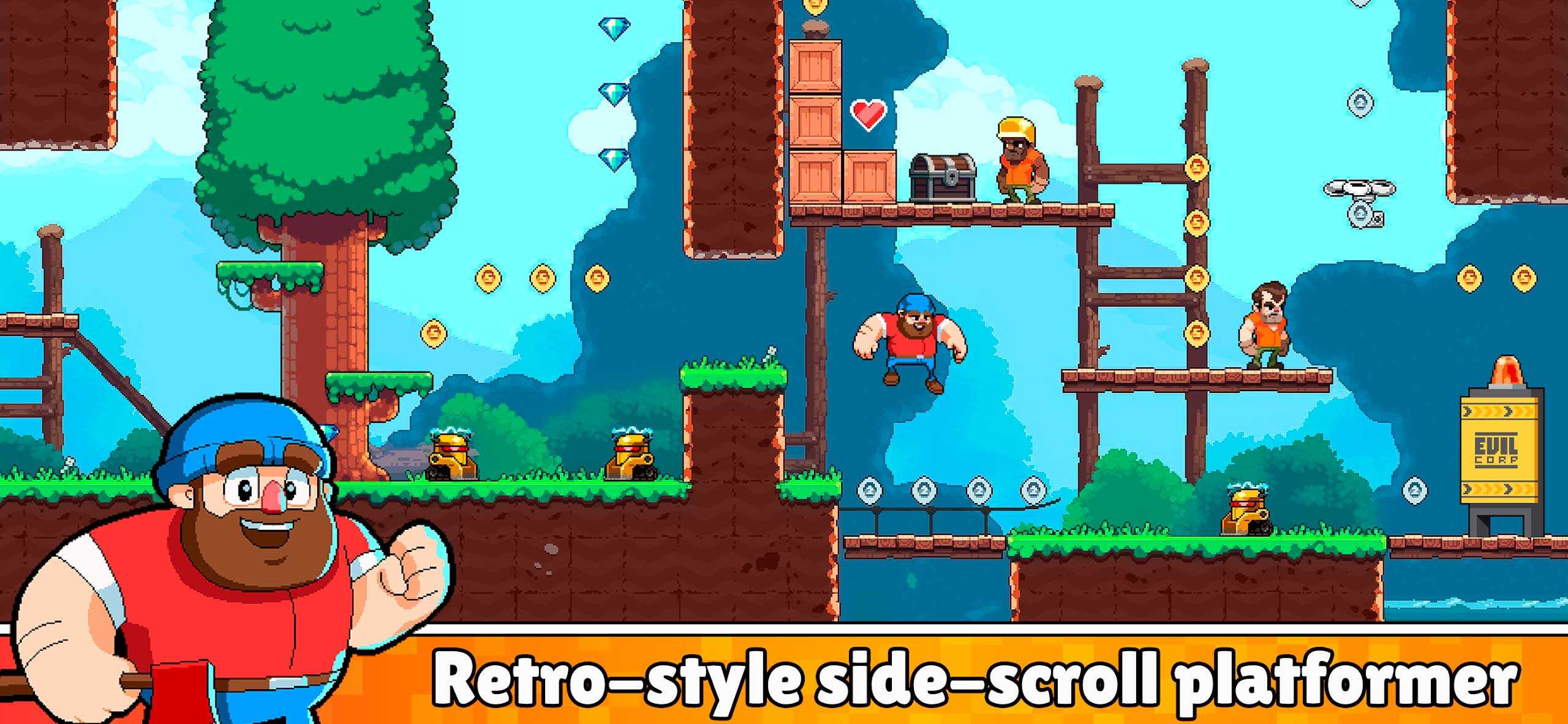 Timberman The Big Adventure – это веселая мобильная игра, в которой вам предстоит спасать лес от корпоративных злодеев. В образе главного героя лесоруба и его верного помощника помогите друзьям сохранить природные богатства и их родной дом, проходя многочисленные уровни. Эпичные битвы с боссами станут отличным испытанием для вашего боевого мастерства. Игра выполнена в ретро стиле и двухмерной графике, так что многие опытные игроки могут почувствовать ностальгию. Геймплей простой и незатейливый, затягивает с первых же минут.