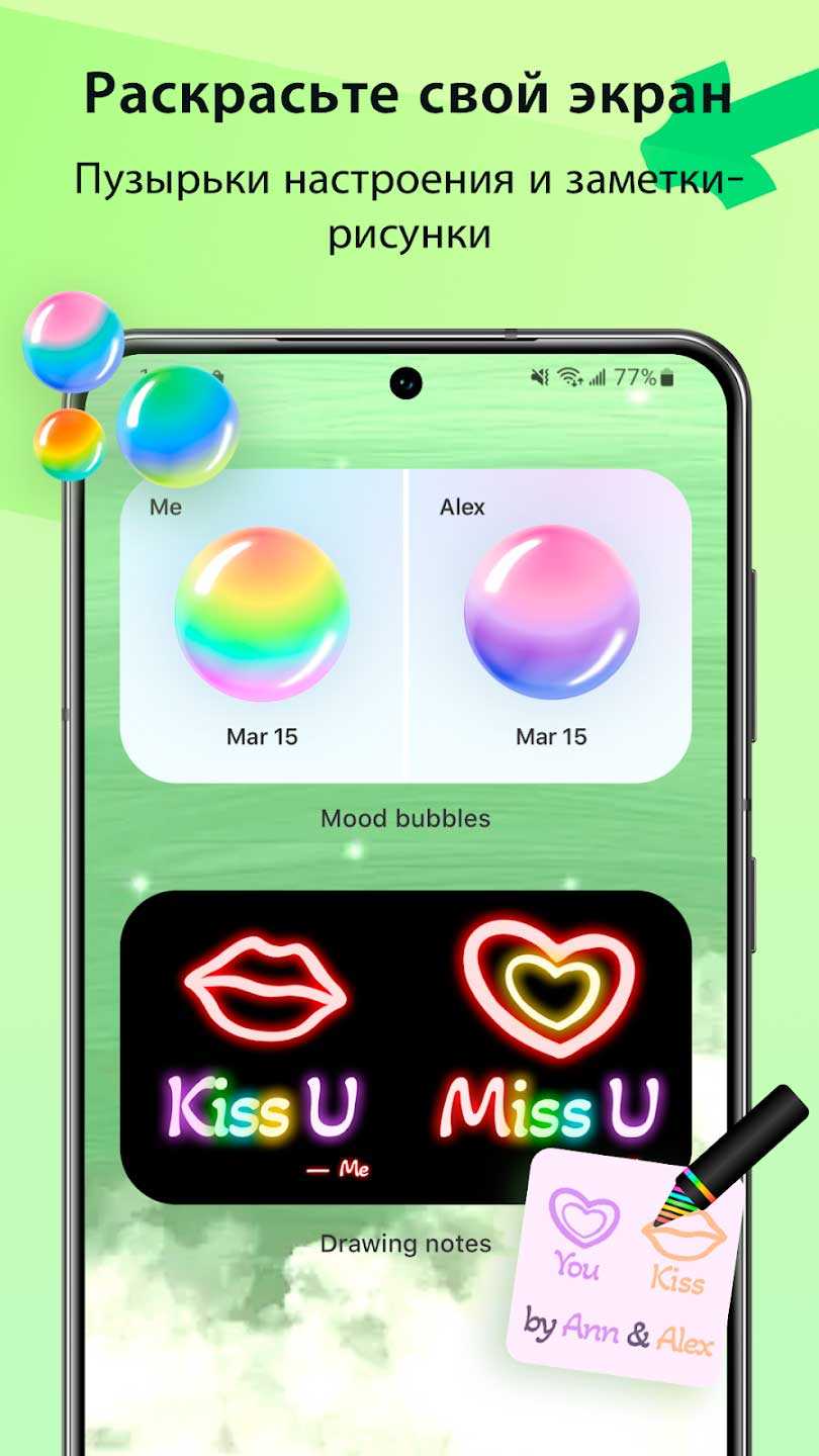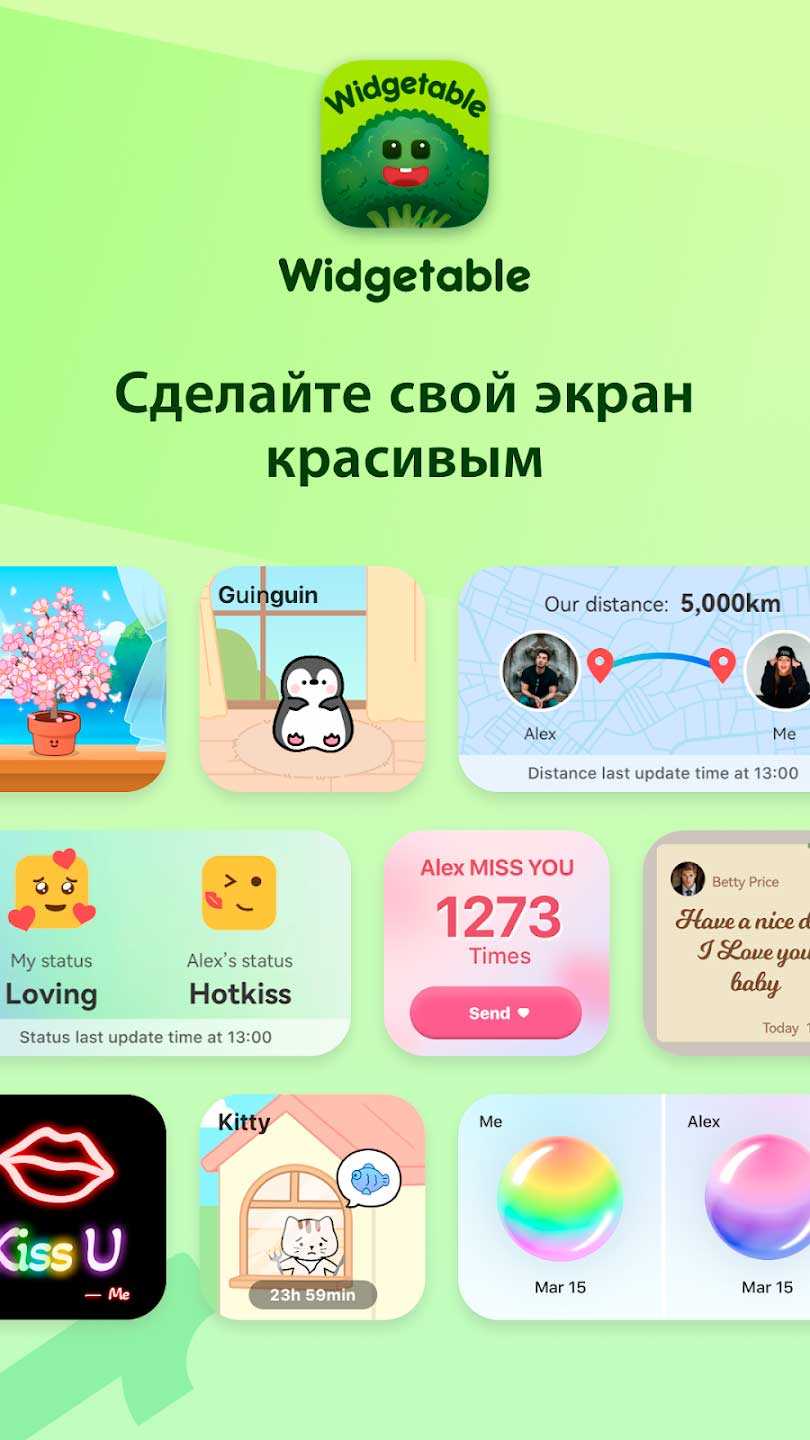 Widgetable: Весёлые экраны – это широкий выбор виджетов для телефона, которые сделают ваше устройство просто очаровательным. Есть виджеты для домашних животных, растений, друзей и приятелей, различные забавные элементы для экрана и не только. Выращивайте виртуальных питомцев и растения на своем устройстве и наслаждайтесь милотой каждый день. Их можно воспитывать одному или совместно со своим партнером, что порой еще интереснее. Создавайте пузыри настроения, наполняя их разными цветами, чтобы отразить свое настроение.